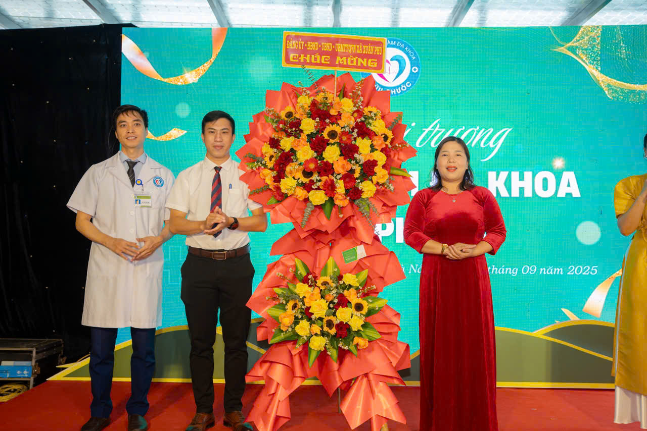 Tại buổi lễ, đại diện lãnh đạo UBND xã đã trao hoa chúc mừng, thể hiện sự quan tâm, kỳ vọng đối với sự phát triển của phòng khám.