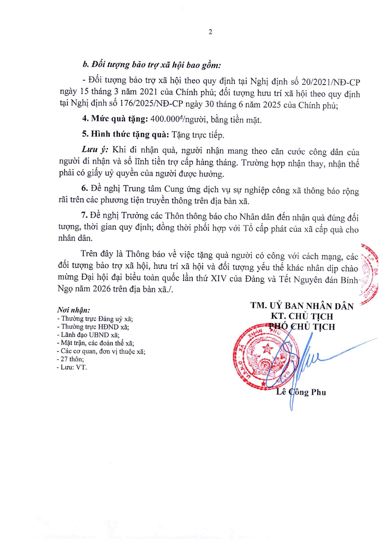 UBND xã Xuân Phú Thông báo tặng quà cho Người có công, đối tượng bảo trợ xã hội, hưu trí xã hội và đối tượng yếu thế khác nhân dịp Chào mừng Đại hội đại biểu toàn quốc lần thứ XIV của Đảng và Tết Nguyên đán Bính Ngọ 2026!