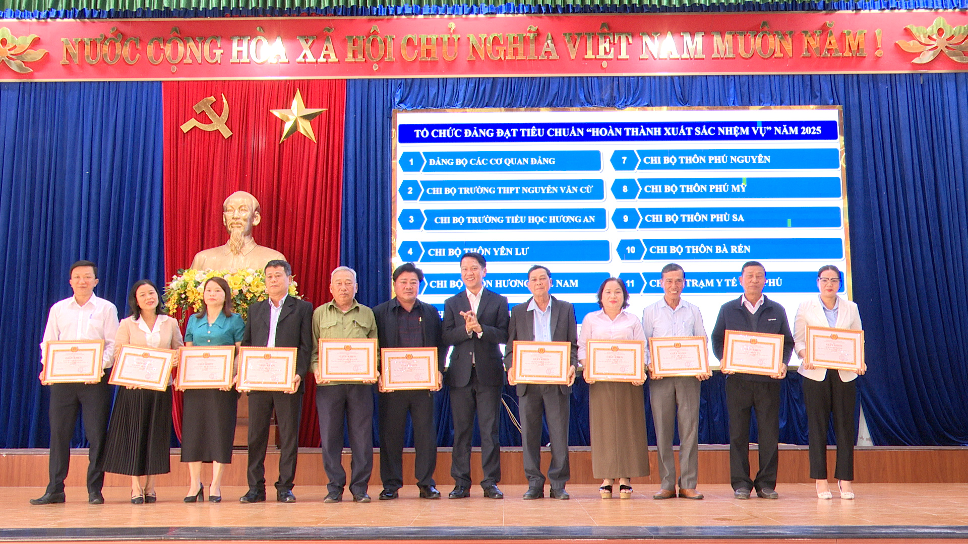 Dịp này, Đảng ủy xã Xuân Phú đã tặng Giấy khen cho 11 tổ chức đảng đạt tiêu chuẩn “Hoàn thành xuất sắc nhiệm vụ” năm 2025; khen thưởng 04 đảng viên đạt danh hiệu “Hoàn thành xuất sắc nhiệm vụ” 5 năm liền (2021–2025) và khen thưởng 146 đảng viên đạt danh hiệu “Hoàn thành xuất sắc nhiệm vụ” năm 2025.