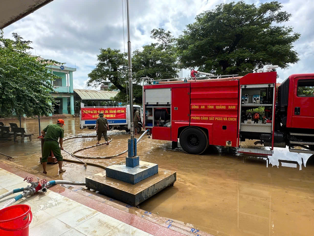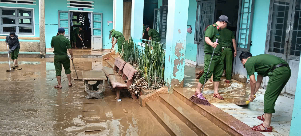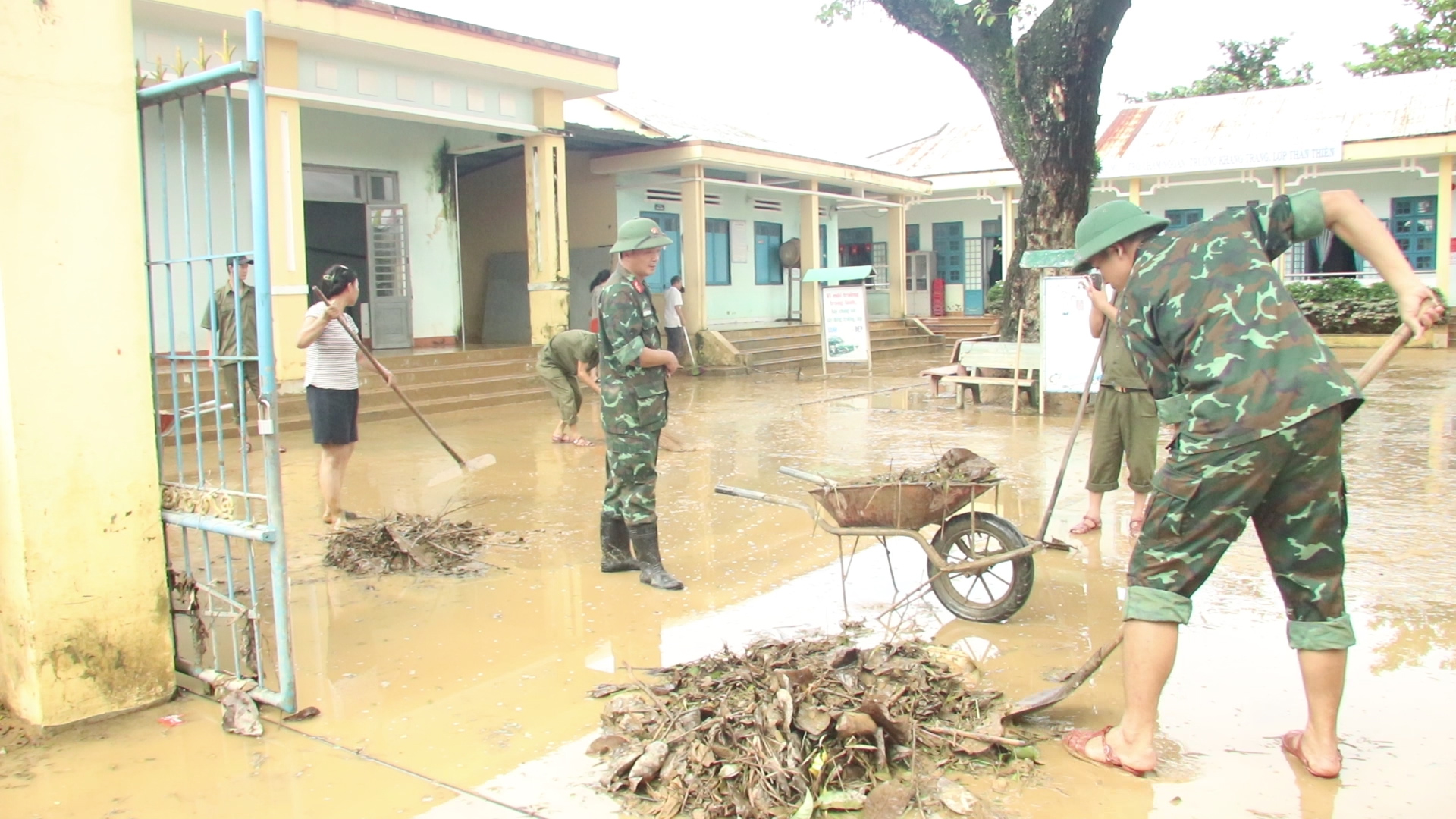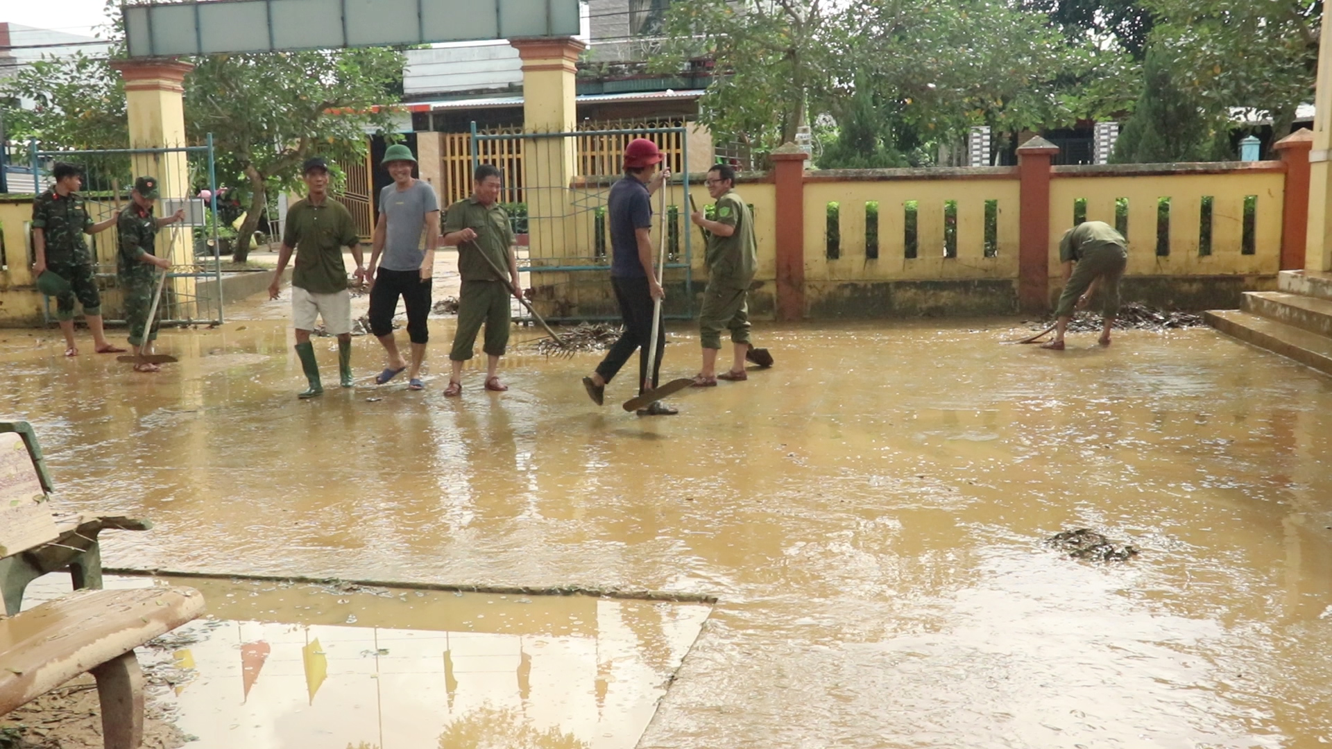 Trong sáng nay, các lực lượng tại chỗ của xã gồm công an, cán bộ, bộ đội, Ban công tác Mặt trận các thôn, cùng giáo viên và phụ huynh học sinh đã tích cực tham gia dọn bùn đất, thu gom rác thải, lau chùi bàn ghế, khử khuẩn khuôn viên, sắp xếp lại đồ dùng học tập bị ảnh hưởng sau mưa lũ.