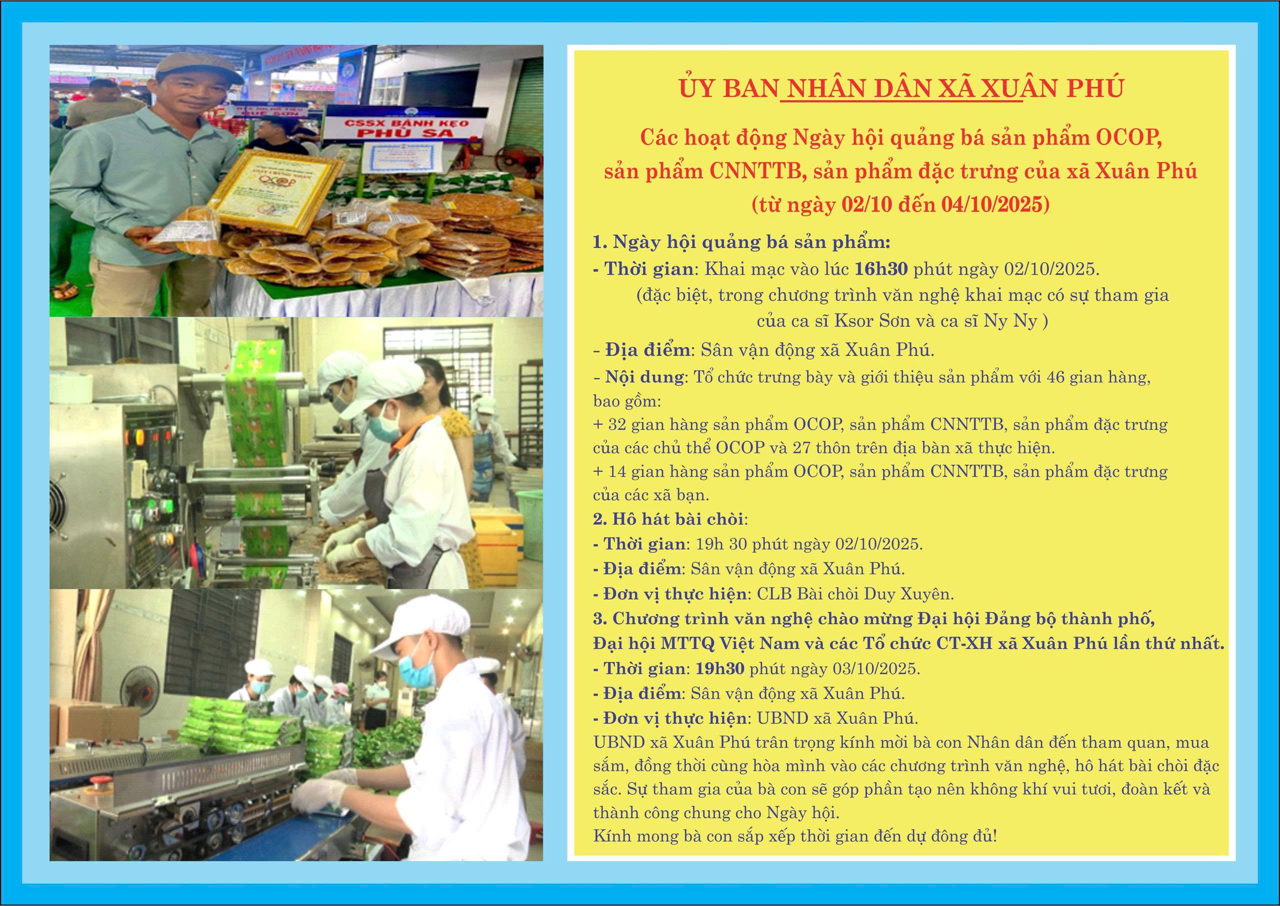 Nhằm quảng bá, giới thiệu các sản phẩm OCOP, sản phẩm công nghiệp nông thôn tiêu biểu và sản phẩm đặc trưng của địa phương, từ ngày 02 đến ngày 04/10/2025, UBND xã Xuân Phú tổ chức Ngày hội quảng bá sản phẩm tại sân vận động xã.